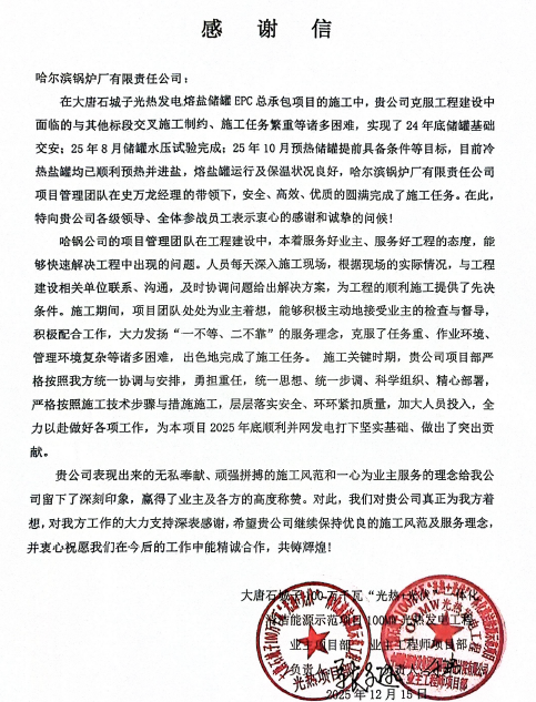 光热熔盐储罐EPC项目的感谢信。